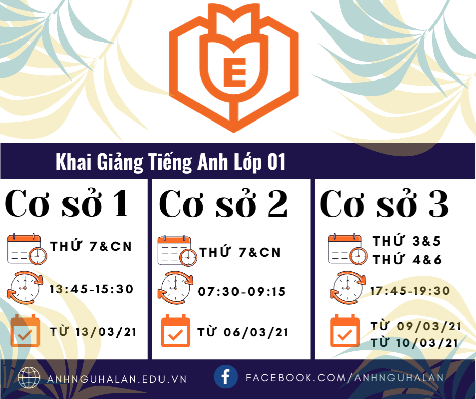 ✅ Cơ sở 3: 17h45- 19h30, Thứ 3 và Thứ 5, Thứ 4 và Thứ 6, bắt đầu từ 09/03/2021 và 10/03/2021.