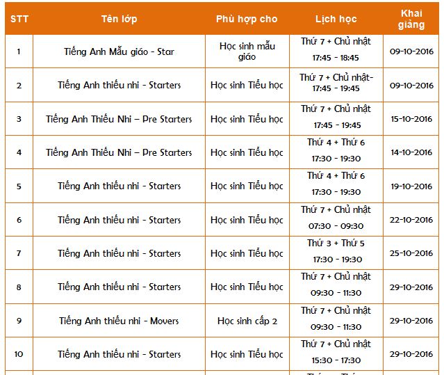 LỊCH KHAI GIẢNG THÁNG 10/2016