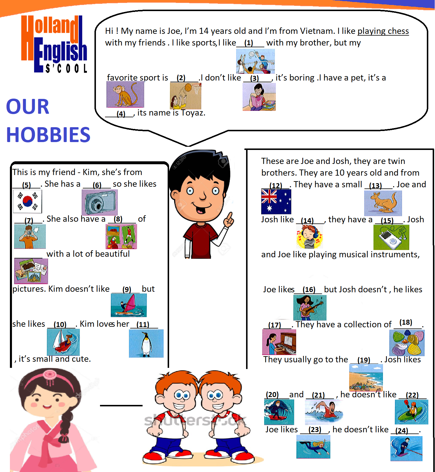 Sau đây là bài tập ôn luyện TỪ VỰNG CHO HỌC SINH LỚP 5. Các em học sinh chú ý, nếu là "động từ" sau like/likes sẽ thêm -ing nhé.