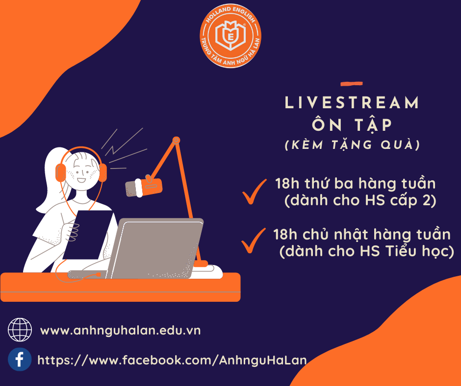 ✨✨ Nhằm củng cố các kiến thức đã học và bổ sung một số kiến thức mới trong thời gian nghỉ dịch covid 19, Trung tâm Anh Ngữ Hà Lan tố chức các buổi livestream dành cho học sinh cấp 1 và cấp 2 cụ thể như sau: