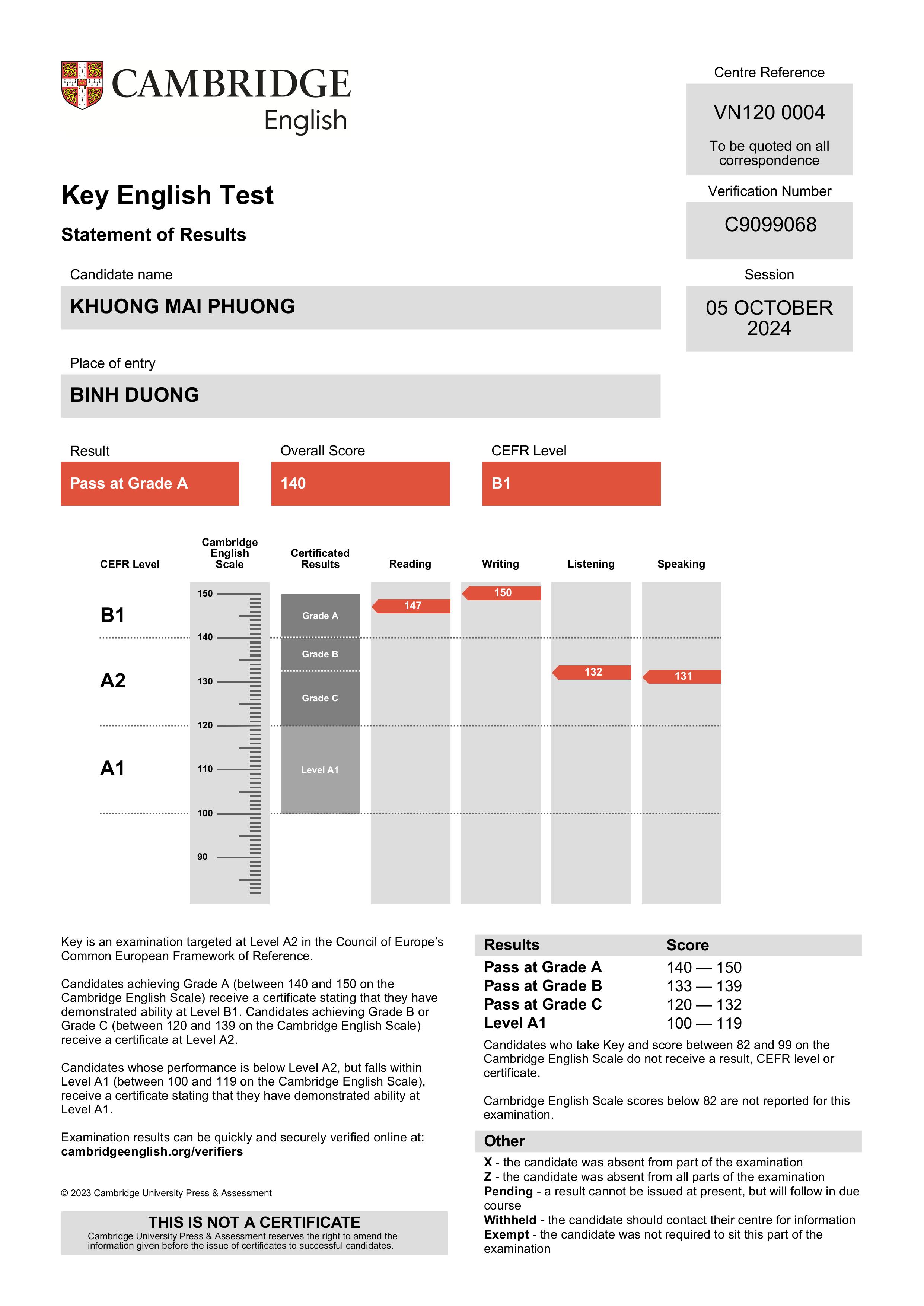 KET (Key English Test là chứng chỉ tiếng Anh quốc tế tương đương với trình độ A2 trên Khung Tham Chiếu Chung Châu Âu (CEFR). Đây là bước tiếp nối tự nhiên dành cho học sinh sau khi hoàn thành chương trình Cambridge English: Young Learners (YLE). Chứng chỉ này được thiết kế đặc biệt để phù hợp với lứa tuổi học sinh từ 12 đến 14 tuổi.